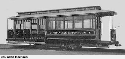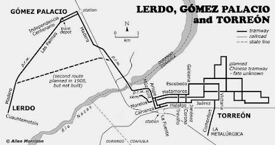 DE TORREON A LERDO.- Las ciudades de Lerdo, Gómez Palacio y Torreón, en el norte de México, a 1,140 kilometros de la capital, se consideran en un solo conjunto: las 3 estuvieron conectadas por un tranvía interestatal durante 52 años. Lerdo y Gómez Palacio son los pueblos pequeños, de edad en el estado de Durango. Torreón, al otro lado del río Nazas en el estado de Coahuila, no llegó a ser una Ciudad hasta 1907 es la ciudad mas grande de las 3 en la actualidad. La regón creció en el cruce de dos ferrocarriles, el Ferrocarril Central desde Ciudad Juárez a la ciudad de México, que llegó a la región en 1883, y el Internacional, de Eagle Pass a Mazatlán, que llegó en 1888 (en realidad esta línea nunca llegó a Mazatlan por la dificultad geográfica).