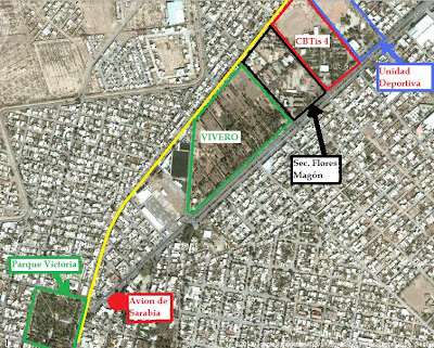 Aqui se ve que el trazado delimitó la calle El Siglo de Torreon, en Gomez Palacio, se curva para llegar a las vias del tren, las cuales cruzaba como vimos en la foto más arriba