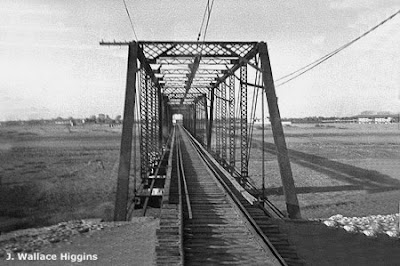 El puente sobre el río Nazas tenía de 200 m / 650 pies de largo. En la foto de abajo la vista es hacia el norte, hacia Gómez Palacio. El coche de motor y remolques están a punto de llegar en el estado de Coahuila [Álbum de la Paz y El Trabajo]: