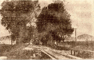 Más allá de la vía férrea el tranvía pasaba por una serie de curvas a través de una llanura desolada hacia el valle del río Nazas[ver mapa]. [Archivo Histórico " SJ Juan Agustín de Espinoza" en la Universidad Iberoamericana de Torreón]: