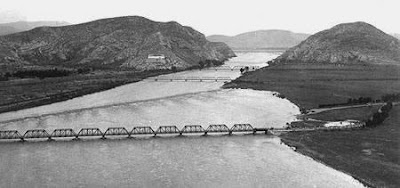 La postal a continuación, de la década de 1930, muestra la geografía de la región. El fotógrafo estaba volando sobre el suroeste del Río Nazas en el estado de Coahuila, con  Durango en la derecha. El puente en el primer plano es para los automóviles. El puente del medio junto a la represa fue la línea de tranvía. el más alejado, cerca de las colinas, es del ferrocarril. La ciudad de Torreón esta fuera de vista [col. AM]: