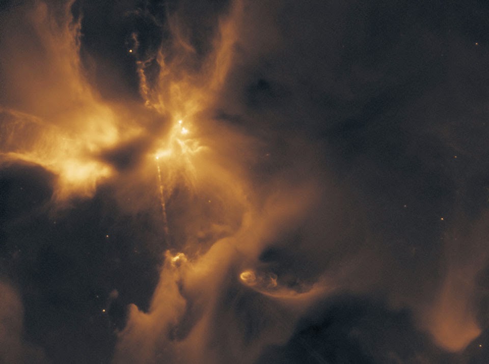 La Nube Molecular de Orion B, en realidad es un complejo sistema de nebulosas que incluye a formaciones tan famosas como la nebulosa de la Flama, la de la Cabeza de Caballo, o el Giro de Barnard. Se aprecia además una corriente de chorro bidireccional emergiendo de una estrella oculta entre el polvo estelar, es el objeto Herbig-Haro HH24. Este tipo de objetos llevan este nombre en parte al trabajo del astrónomo mexicano Guillermo Haro.