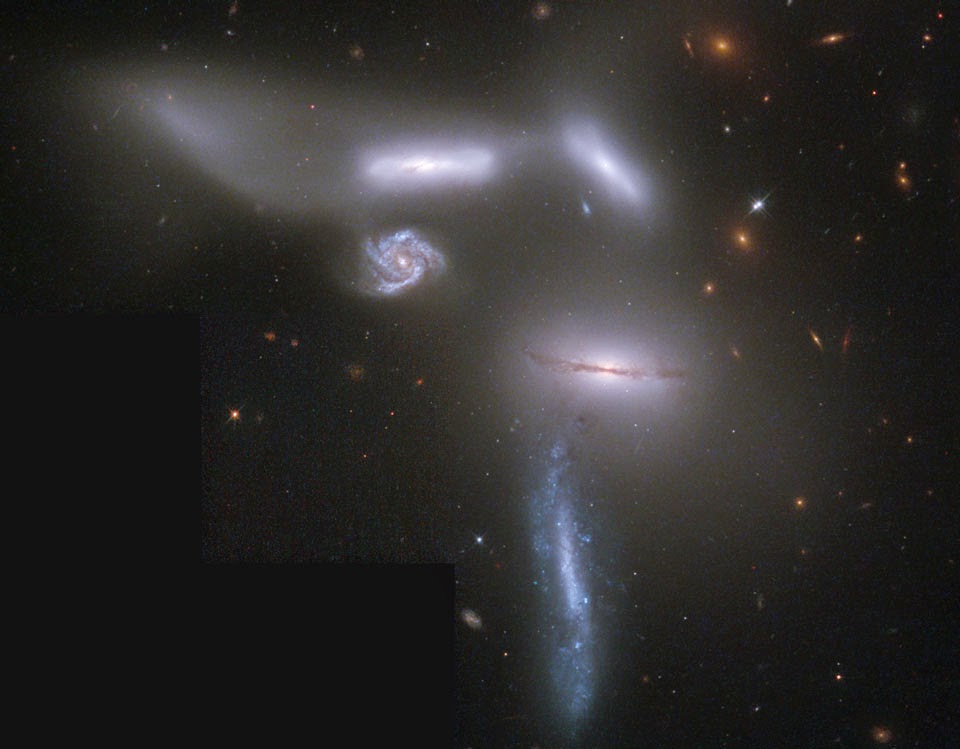 La verdadera Guerra de las Galaxias. El Sexteto de Seyfert se ubica en la constelacion de la Serpiente, y aunque el nombre y la imagen parecen ser congruentes, en realidad el sexteto se forma de cuatro galaxias a punto de colisionar y fusionarse entre sí, arriba a la izquierda está la galaxia NGC6027 con forma de lente, a su lado está NGC6027b, con una forma de x, en el centro vemos la NGC6027a, que se parece mucho a la famosa galaxia del sombrero, y en la parte de abajo vemos a NGC6027c, con forma espiral alargada en sentido vertical. Todas estas galaxias están a unos 190 millones de años luz de nosotros. Debido a esa fuerte interacción se han formado mareas de polvo y estrellas que han sido arrancadas por las galaxias entre sí, siendo más notable la formación en la extrema izquierda superior, que se conoce como NGC6027e, a pesar de que no es propiamente una galaxia, El miembro que completa el sexteto es NGG6027d, la galaxia claramente en espiral cerca del centro, sin embargo no tiene nada que ver con las otras cuatro, porque está a 877 millones de años luz, sólo que aparece en el fondo, la clásica colada en la foto.